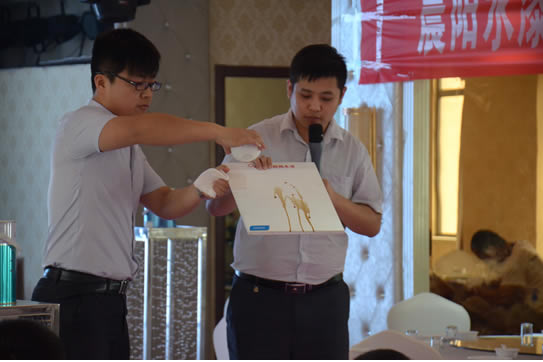 當(dāng)天,還舉行了晨陽(yáng)水漆產(chǎn)品推廣會(huì)。晨陽(yáng)水漆培訓(xùn)部員工介紹了公司的歷史背景、水漆未來(lái)的發(fā)展趨勢(shì)、國(guó)家相關(guān)扶持政策和2015年品牌發(fā)展方向。現(xiàn)場(chǎng),通過(guò)產(chǎn)品試刷和養(yǎng)金魚試驗(yàn),油工師傅們對(duì)晨陽(yáng)水漆產(chǎn)品環(huán)保特性和施工效果表示肯定。