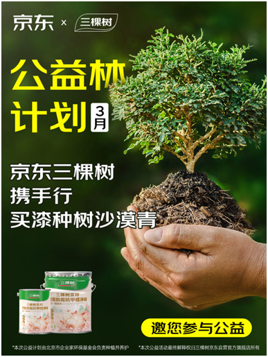 伴隨新品上市,延續(xù)三棵樹“健康+自然”的品牌基因,三棵樹與京東聯(lián)合啟動(dòng)"買一漆種一樹":3月活動(dòng)期間,每新增一位JC乳膠漆系列購買用戶,品牌將在內(nèi)蒙古阿拉善荒漠化地區(qū)種植一棵樹。